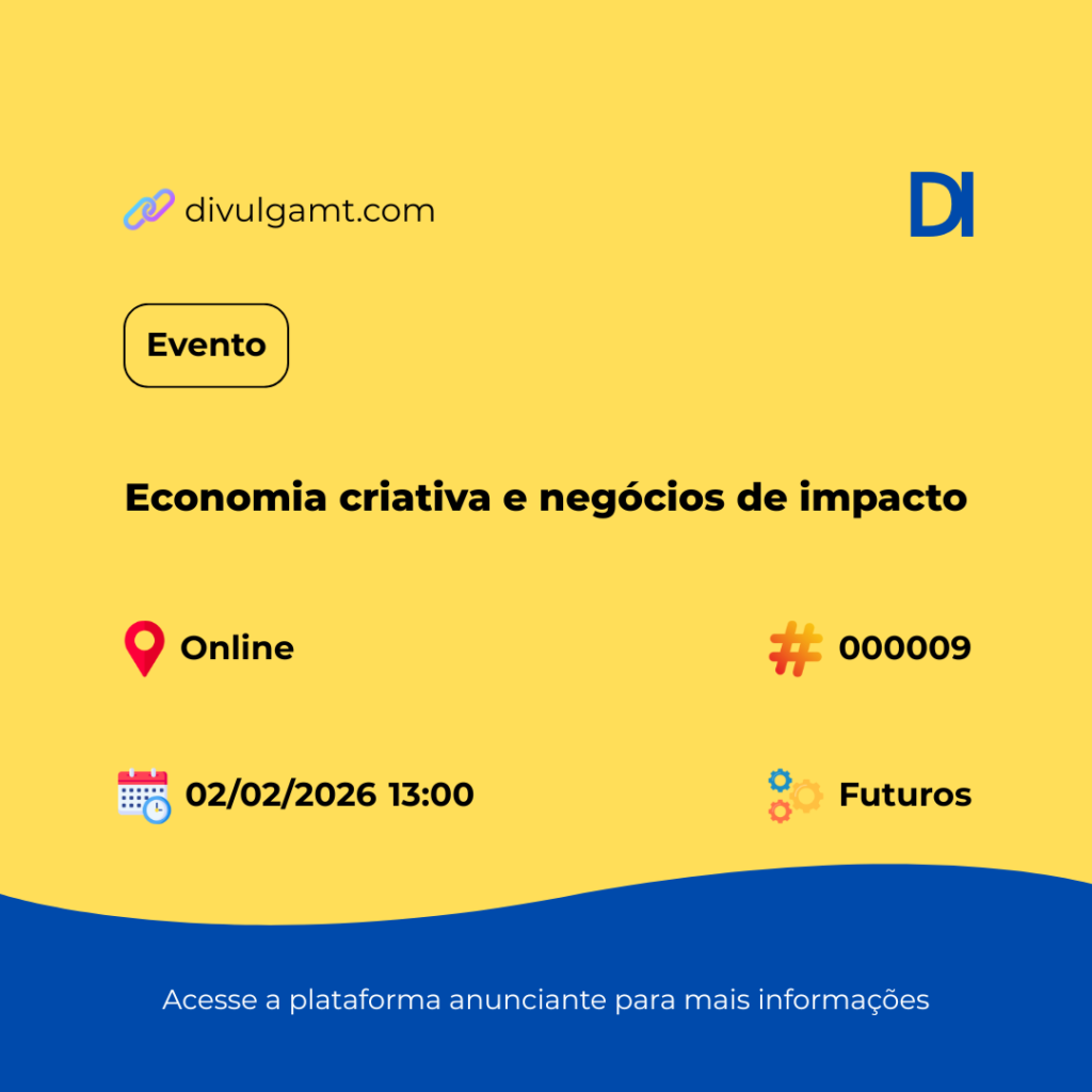 No dia 02/02/2026, a Futuros promove o evento online Economia criativa e negócios de impacto. Garanta sua participação inscrevendo-se agora: https://docs.google.com/forms/d/e/1FAIpQLSc_SaUzmNu9dA2wEMPH7wZrSBmJCTDMtmX4cD4BihsCNR_-uQ/viewform. O encontro começa às 13:00 e é imperdível para empreendedores visionários. Confira mais detalhes no nosso portal usando o código 000009. Confira nossas redes sociais através do link https://linktr.ee/divulgamtdmt