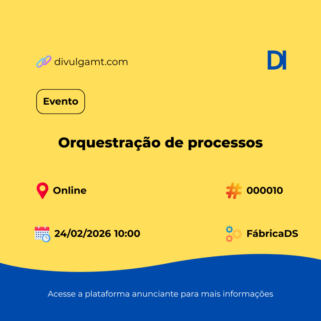 No dia 24/02/2026, a FábricaDS realiza o evento Orquestração de processos em formato totalmente online. Faça sua inscrição aqui: https://conteudo.fabricads.com.br/Webinar_IBMWatson. A transmissão inicia às 10:00, trazendo insights valiosos sobre eficiência e tecnologia. Confira mais detalhes no nosso portal usando o código 000010. Confira nossas redes sociais através do link https://linktr.ee/divulgamtdmt