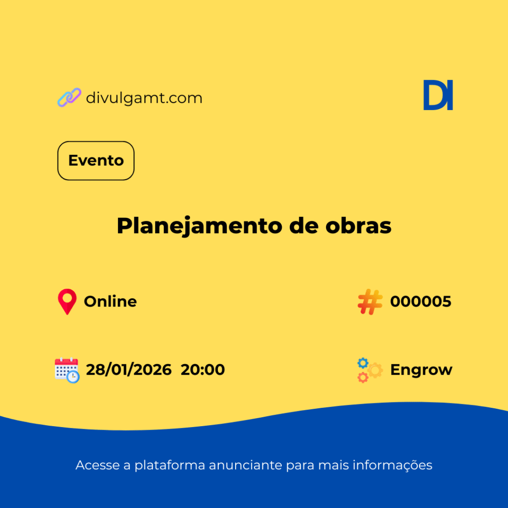 Já marcou na agenda? No dia 28/01/2026, vai rolar o Planejamento de obras na plataforma Online. Garanta sua entrada aqui: http://engrow.com.br/webinar. O evento começa às 20:00 e promete movimentar o setor com muito conhecimento técnico da Engrow. Confira mais detalhes no nosso portal usando o código 000005. Confira nossas redes sociais através do link https://linktr.ee/divulgamtdmt