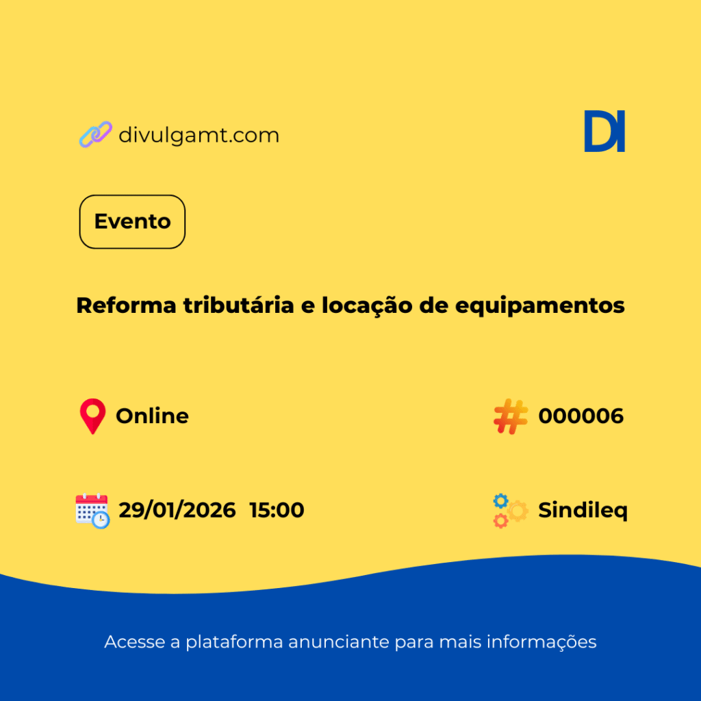 Já marcou na agenda? No dia 29/01/2026, vai rolar o evento Reforma tributária e locação de equipamentos na plataforma Online. Garanta sua entrada e participe dessa discussão essencial clicando aqui: https://docs.google.com/forms/d/e/1FAIpQLSfl4Havn9qD7S5C0tEAJZmpj7DDU0nkIQQhh2RE3vnDlOLWTQ/viewform. O evento, realizado pelo Sindileq, começa às 15:00 e promete tirar todas as suas dúvidas sobre o novo cenário fiscal. Confira mais detalhes no […]