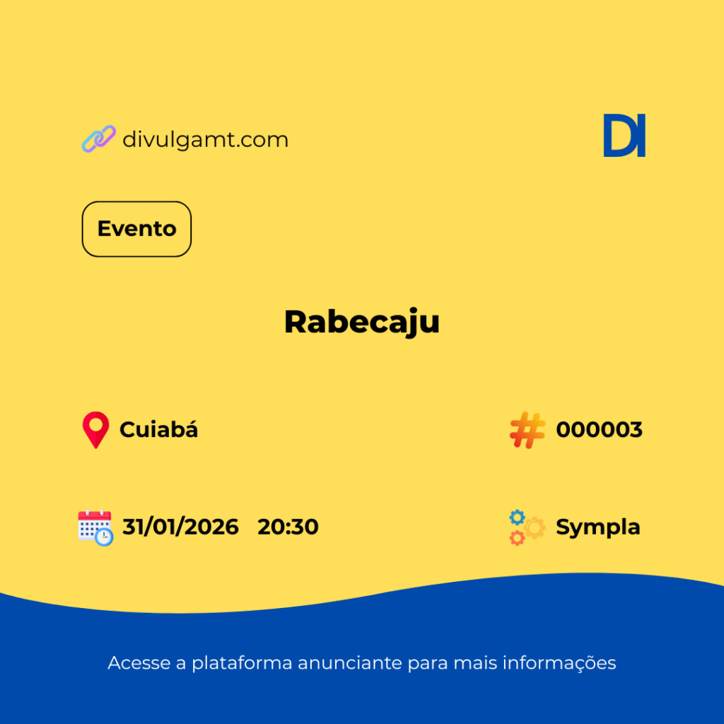 🗓️ AGENDA MT🎉 Evento: Rabecaju📍 Local/Plataforma: Cuiabá / Sympla📅 Data: 31/01/2026 às 20:30 🎟️ Garanta sua vaga: Acesse o link abaixo ou busque pelo código 000003 no nosso portal.🔗 https://www.sympla.com.br/evento/show-rabecaju/3272429?algoliaID=2d7b5969a64f024362e5c22eb96bd743