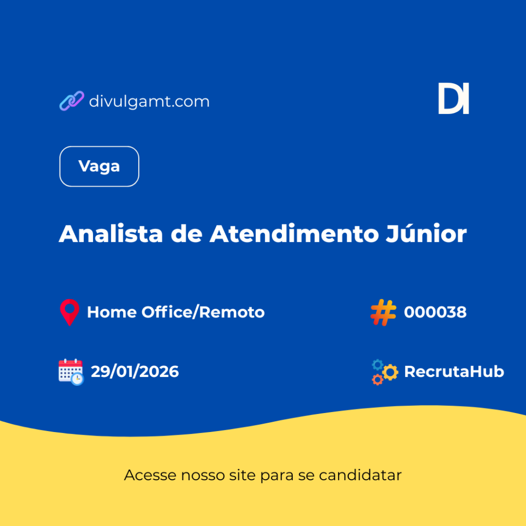 A RecrutaHub está com vaga de Analista de Atendimento Júnior para Home Office/Remoto. Para se candidatar de forma automatizada acesse divulgamt.com e pesquise pelo código 000038 ou envie seu currículo para o e-mail talentosrecrutahub@gmail.com.