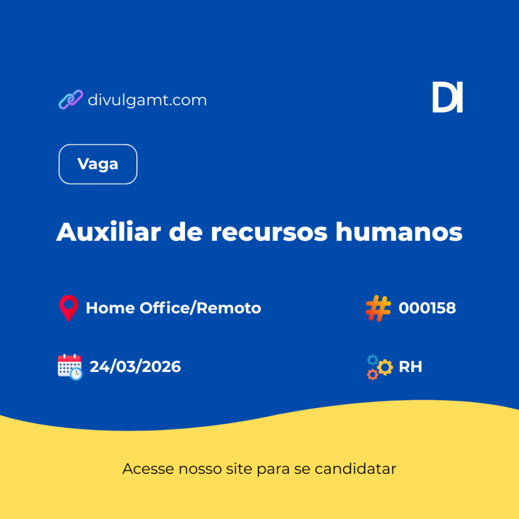 A RH está com vaga de Auxiliar de recursos humanos para Home Office/Remoto. Para se candidatar de forma automatizada acesse divulgamt.com e pesquise pelo código 000158 ou envie seu currículo para o e-mail erickhenrique@rhempresas.com. Não perca essa oportunidade.