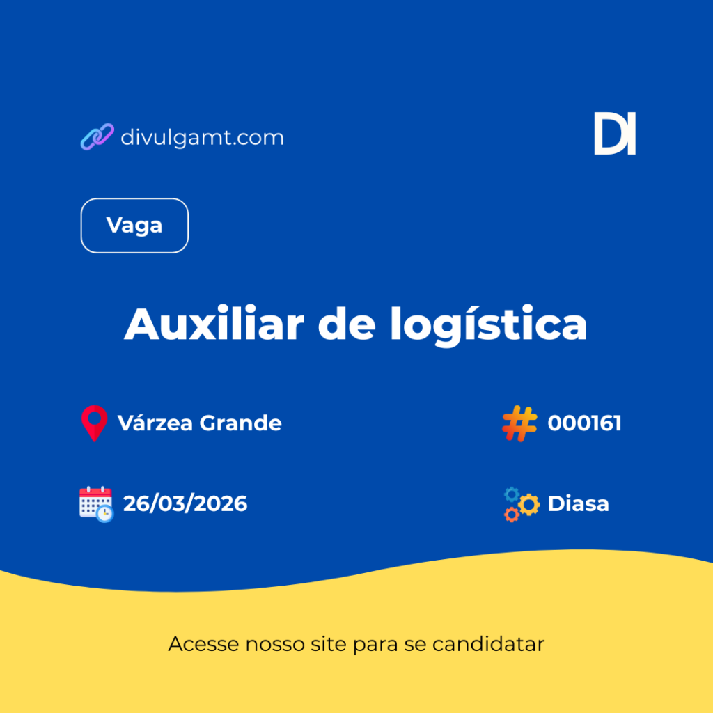 A Diasa está com vaga de Auxiliar de logística para Várzea Grande. Para se candidatar de forma automatizada acesse divulgamt.com e pesquise pelo código 000161 ou envie seu currículo para o e-mail rh@diasa.com.br. Não perca essa oportunidade.