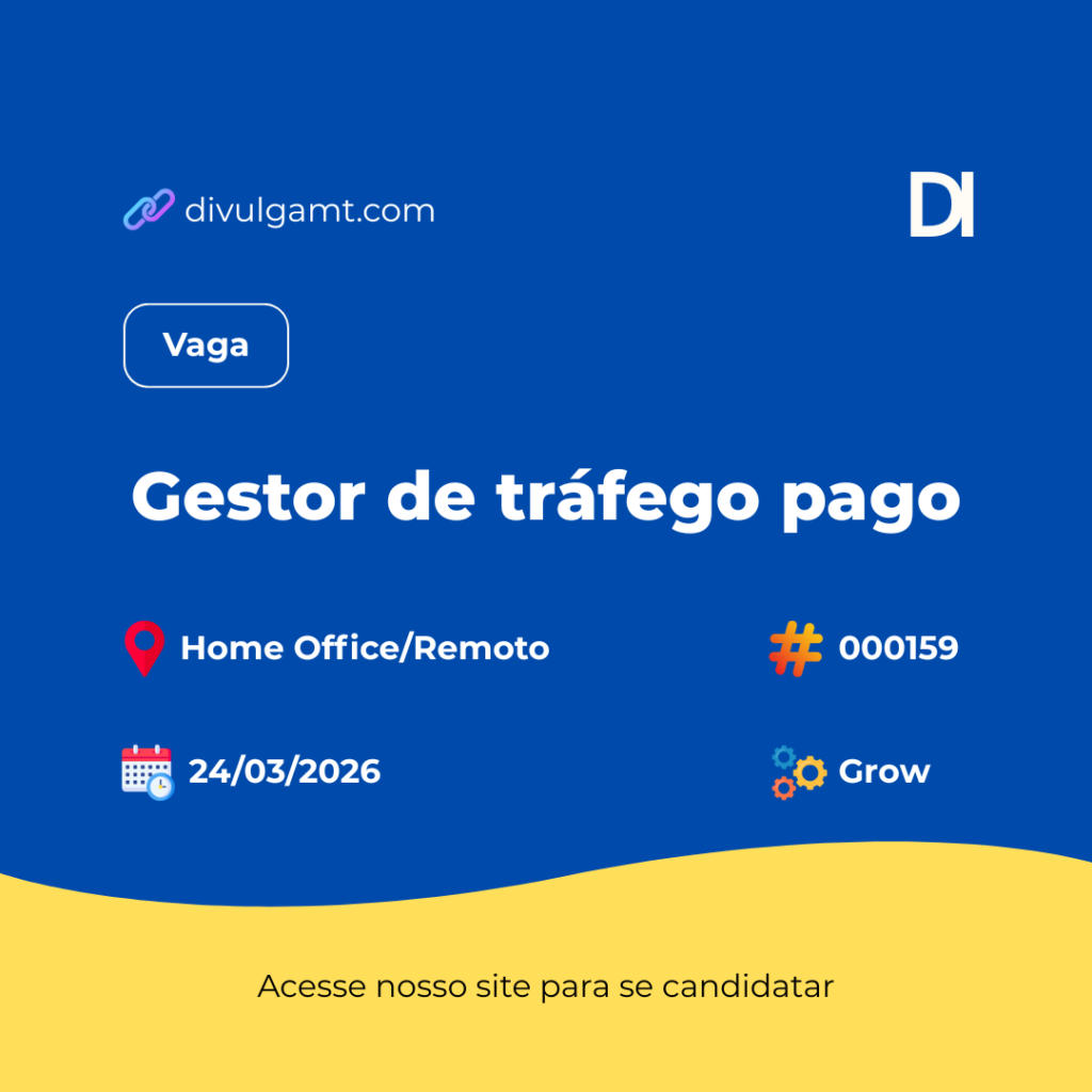 A Grow está com vaga de Gestor de tráfego pago para Home Office/Remoto. Para se candidatar de forma automatizada acesse divulgamt.com e pesquise pelo código 000159 ou envie seu currículo para o e-mail vagasgrow@gmail.com. Não perca essa oportunidade.