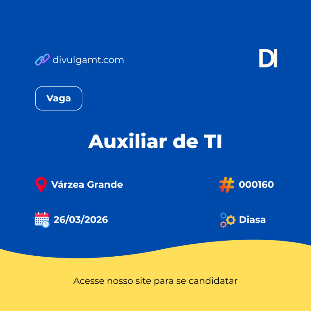 A Diasa está com vaga de Auxiliar de TI para Várzea Grande. Para se candidatar de forma automatizada acesse divulgamt.com e pesquise pelo código 000160 ou envie seu currículo para o e-mail rh@diasa.com.br. Não perca essa oportunidade.