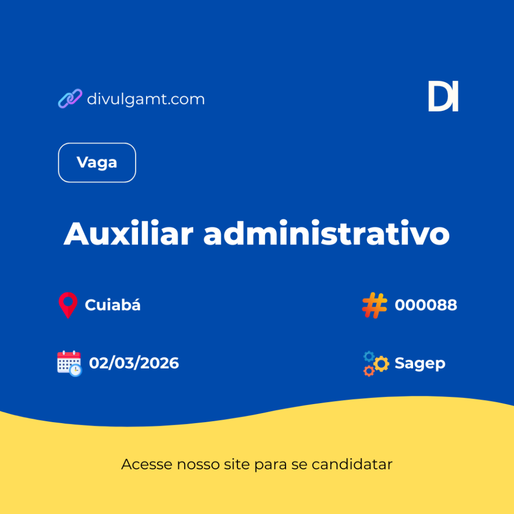 A Sagep está com vaga de Auxiliar administrativo para Cuiabá. Para se candidatar de forma automatizada acesse divulgamt.com e pesquise pelo código 000088 ou envie seu currículo para o e-mail dp@sagep.org.br. Não perca essa oportunidade.