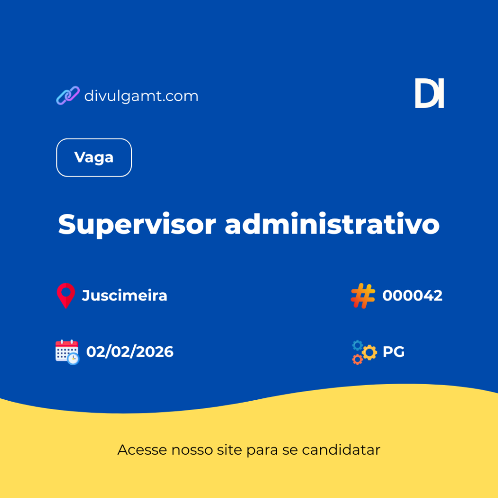A PG está com vaga de Supervisor administrativo para Juscimeira. Para se candidatar de forma automatizada acesse divulgamt.com e pesquise pelo código 000042 ou envie seu currículo para o e-mail karina.silva@pgbongiolo.com.br.