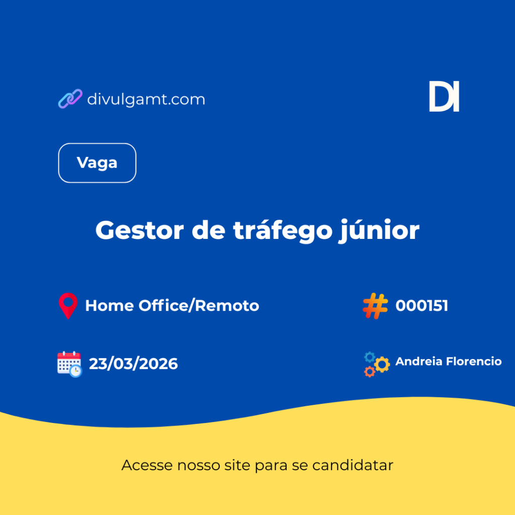 A Andreia Florencio está com vaga de Gestor de tráfego júnior para Home Office/Remoto. Para se candidatar de forma automatizada acesse divulgamt.com e pesquise pelo código 000151 ou envie seu currículo para o e-mail contato@andreiaflorencio.com.br. Não perca essa oportunidade.