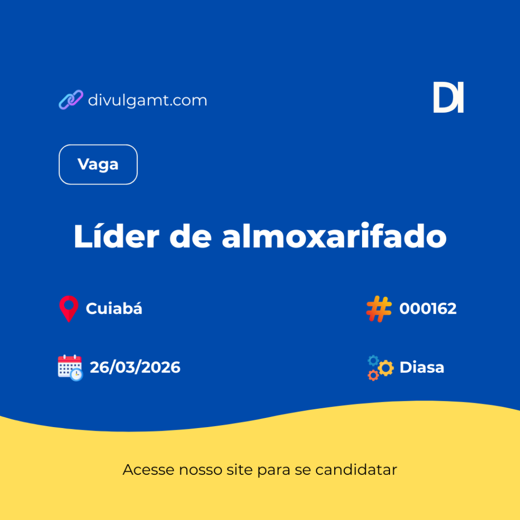 A Diasa está com vaga de Líder de almoxarifado para Cuiabá. Para se candidatar de forma automatizada acesse divulgamt.com e pesquise pelo código 000162 ou envie seu currículo para o e-mail rh@diasa.com.br. Não perca essa oportunidade.